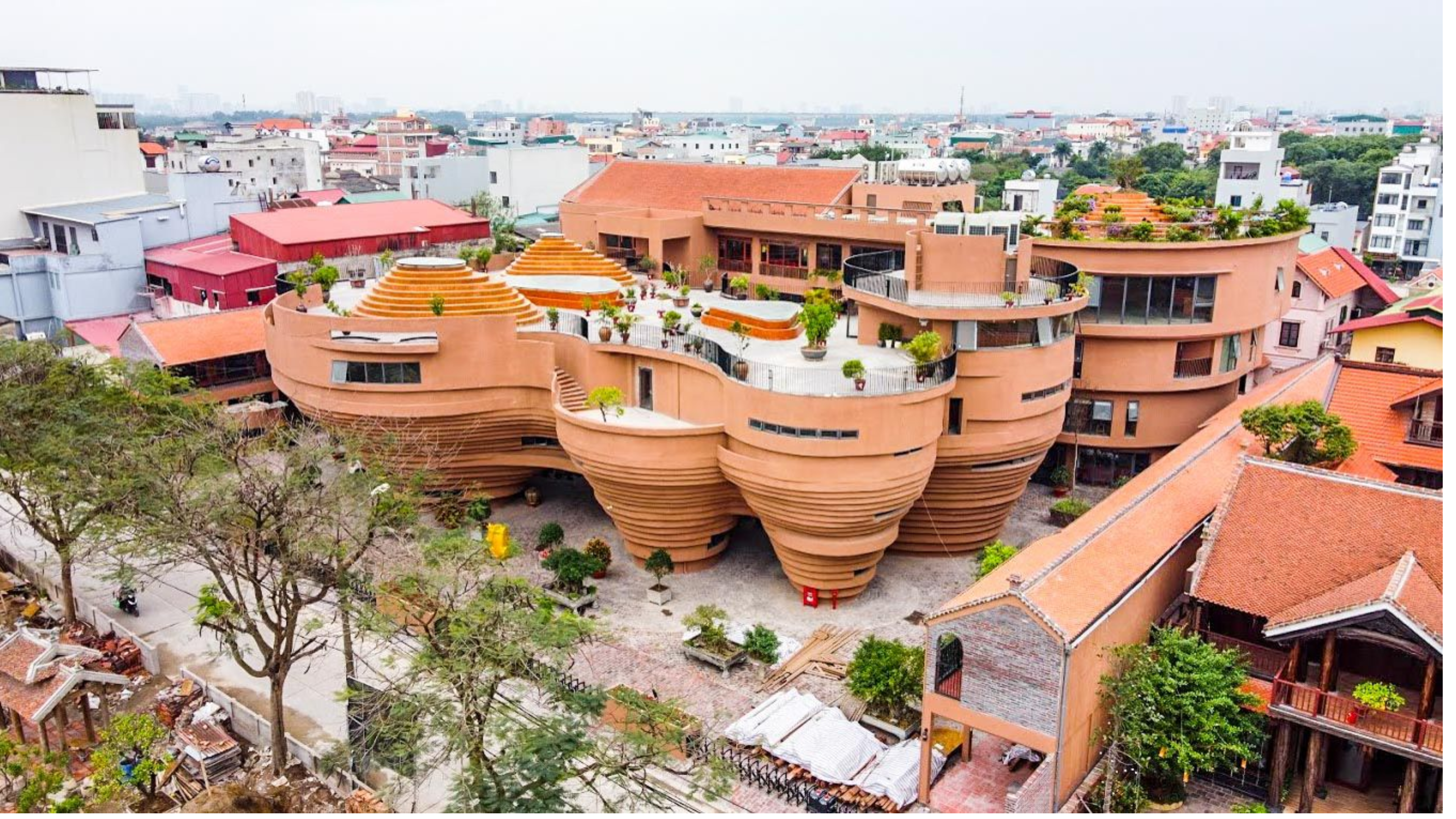 The Bat Trang Pottery Museum was built in 2018, inspired by the pottery wheel of craftsmen creating seven massive tornadoes. The museum is designed smaller at the bottom and larger as it goes up, yet it still feels stable and solid.