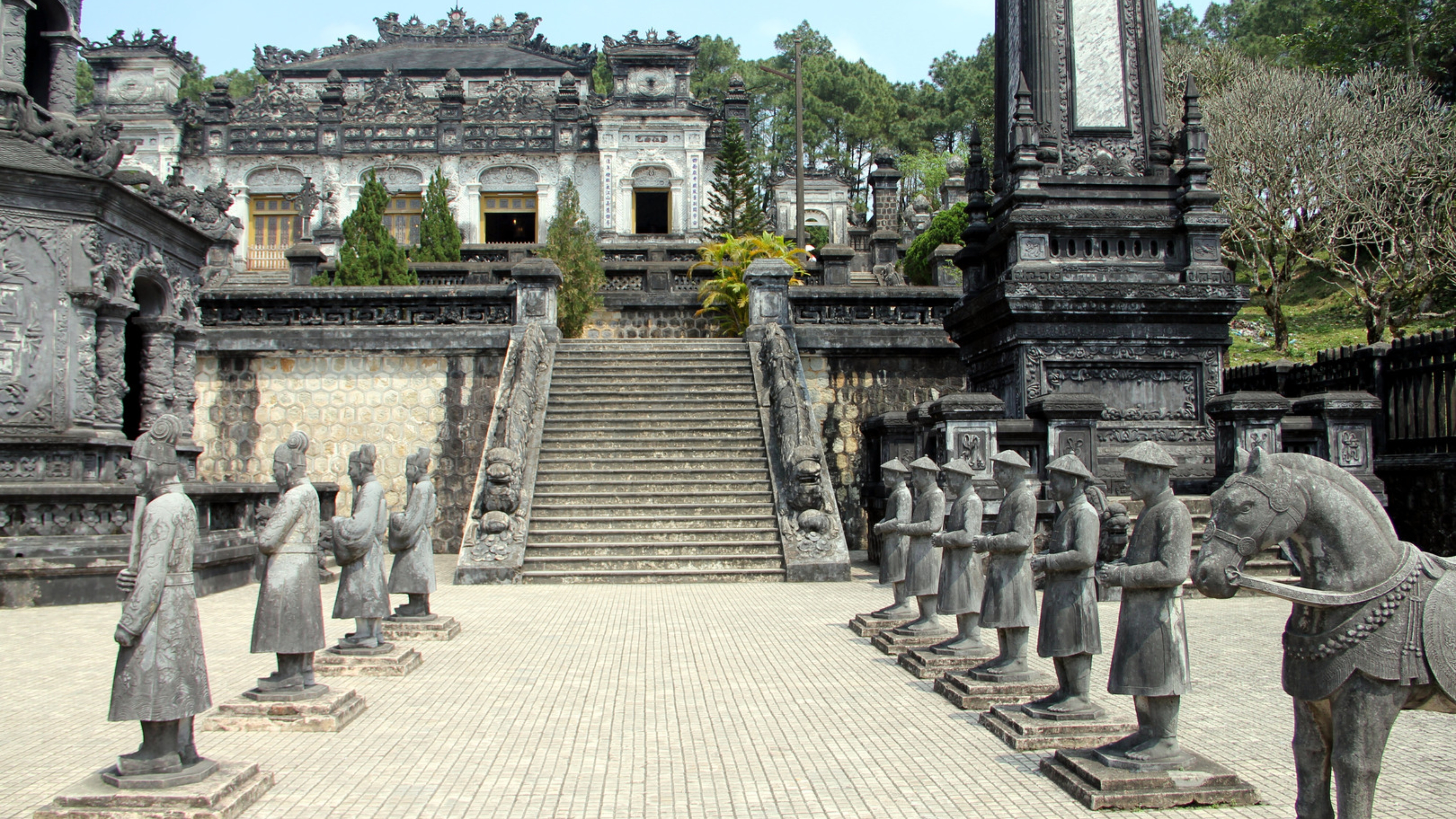 Unlike the more expansive and park-like setting of some royal tombs, the Tomb of Khai Dinh presents a more compact but dramatically elaborate experience. Its monumental design and intricate details are immediately striking. To reach the inner sanctum, you would have to climb a staircase adorned with dragon banisters and traverse a courtyard featuring stone honor guard statues.
