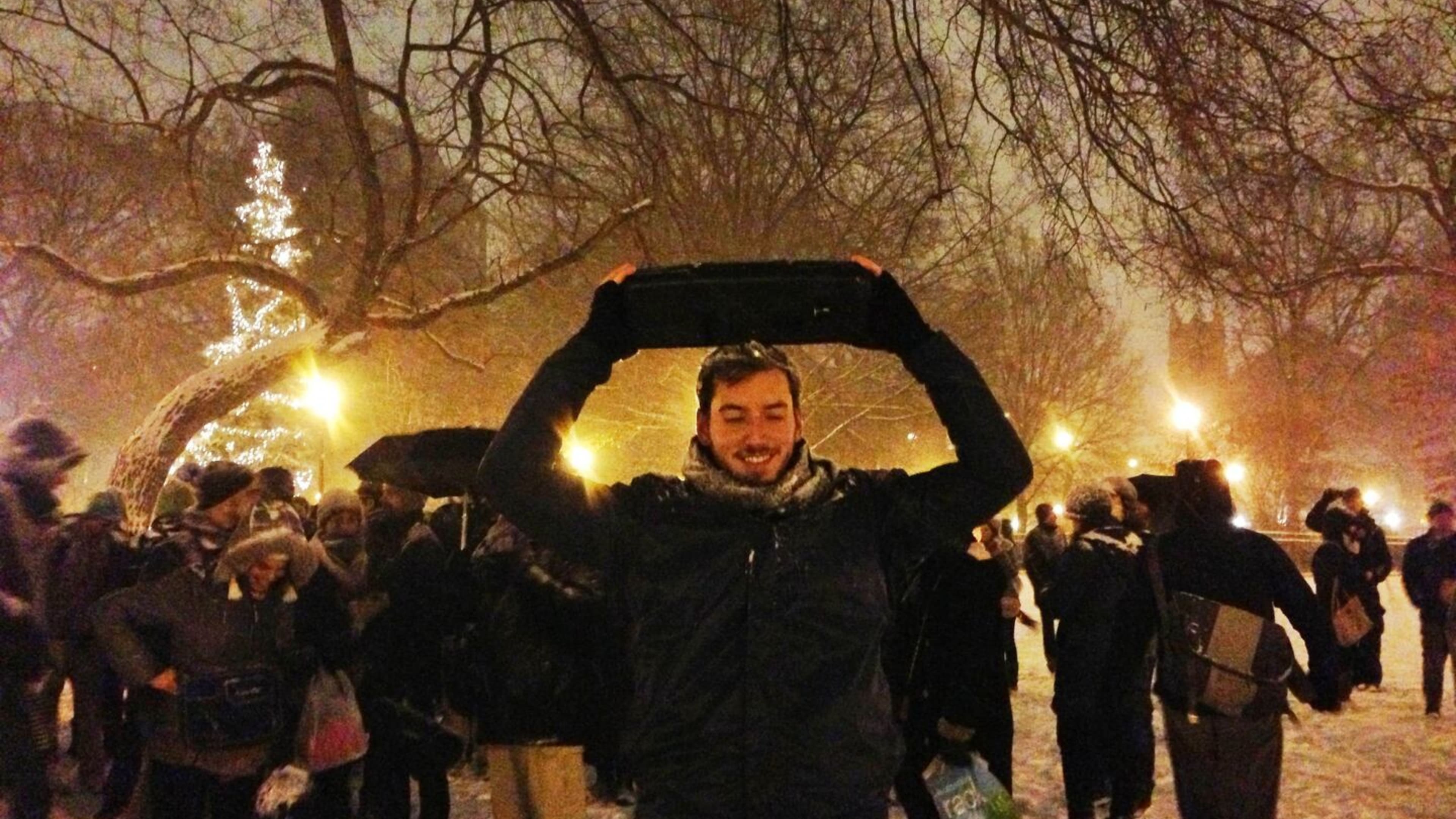 Unsilent Night is the brainchild of composer Phil Kline, who envisioned a "walking caroling party" where participants contribute to a multi-layered musical piece. Each participant plays one of four different tracks of ambient electronic music from their portable device (boombox, phone, etc.) as they walk a designated route. The result is a beautiful, shimmering soundscape that fills the air with holiday spirit.